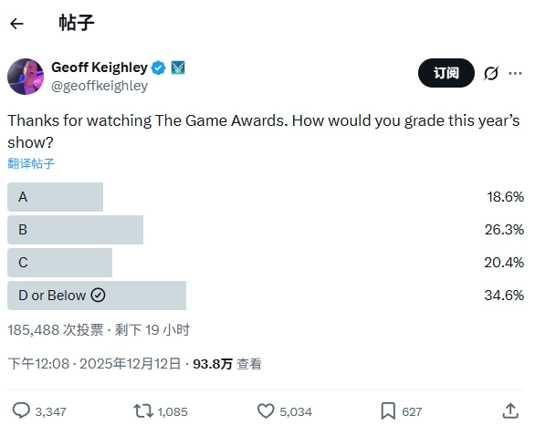 TGA圆满落幕之后,主持人杰夫·基思利在社交平台X上发帖询问玩家们对本届TGA的看法。到目前为止,已经有超过18万玩家参与投票,其中选“A”的玩家仅占18.6%,选“D”的玩家却超过了34.6%,看来不少玩家对这次的TGA并不满意。