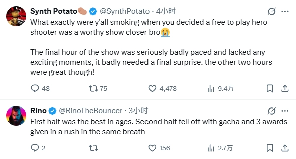 知名游戏博主Synth Potato和Rino也在评论区留言:“你们到底是怎么想的,居然会觉得一款免费游玩的英雄射击游戏能作为压轴项目啊?整场典礼最后一小时的节奏完全乱了,压根没有任何让人激动的高光时刻,真的很需要一个像样的最终惊喜。不过前面两个小时倒是还不错!”