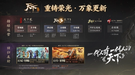 而这,正是《天下:万象》所描绘的未来图景:不再试图用单一版本满足所有众口,而是通过清晰的玩法分区与价值主张,让每一代玩家都能找到属于自己的那片山海。无论是回首过去,还是激战当下,总有一个天下,为你存留灯火。