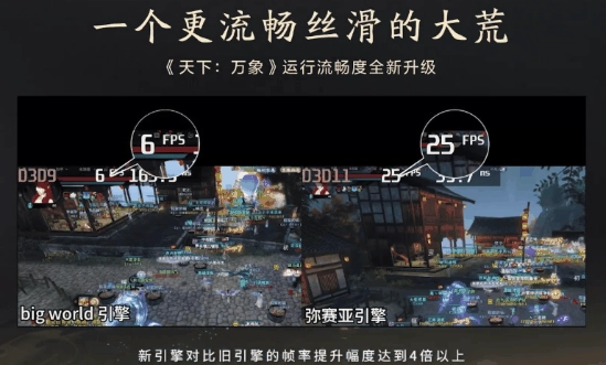 拿一个简单的例子来说,有了新引擎的助力,《天下:万象》的制作团队能够对游戏里的场景展开一次“精雕细琢”的翻新工作。大家以前看到的“纸片树”,如今会以更逼真、更立体的样子展现出来;之前那些卡顿的场景,也可以变得更为流畅。我在现场实际测试之后发现,在多人同屏的场景中,游戏的帧率确实有2到4倍的提升,运行速度也比之前快了很多。