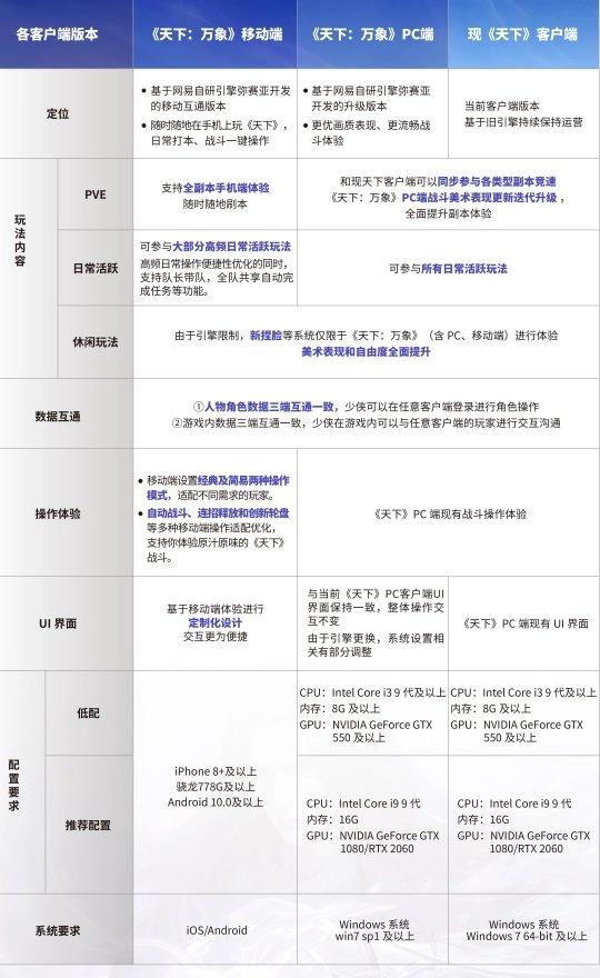 即便你用配置较低的“千元机”,也能流畅运行《天下:万象》。不过,目前的移动端版本暂时无法体验端游的全部玩法,大家可以在公测后,可以参考下方表格了解移动端和端游玩法的具体差异。