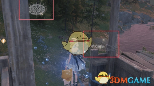 2. 抵达后,需借助图中方框位置的两个蹦床,通过跳跃登上哨塔。