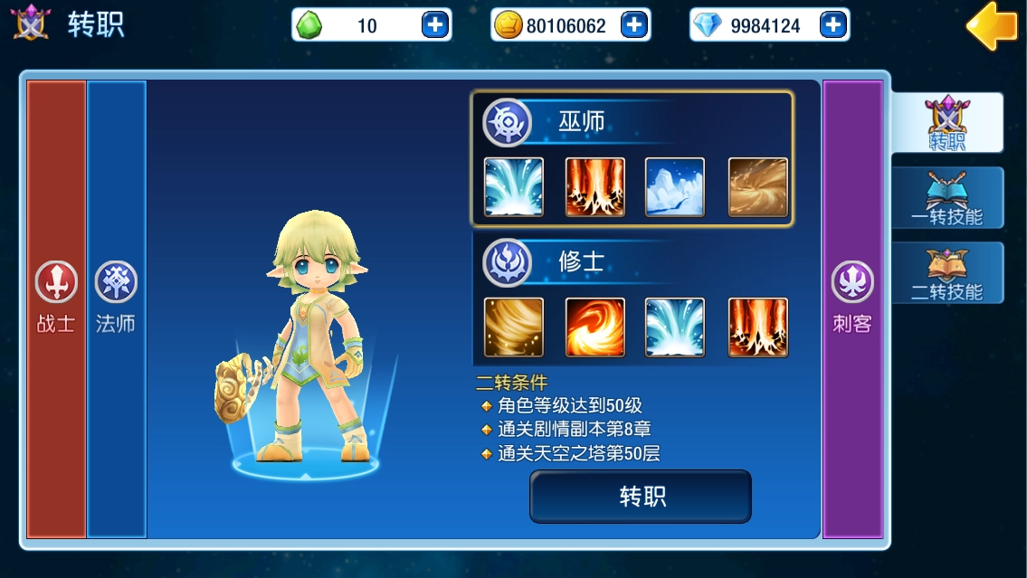 法师转职信息:(二次转职可选择的职业包括:巫师、修士)