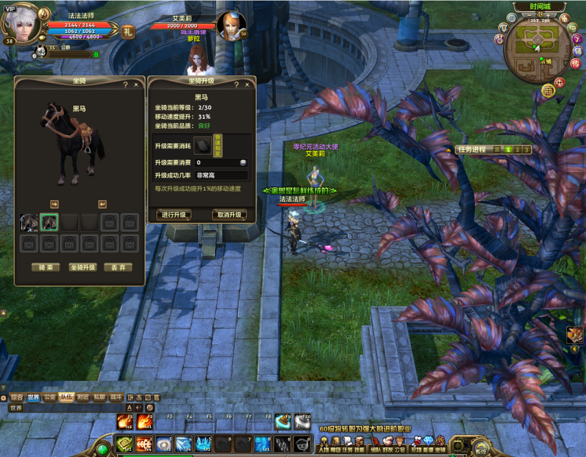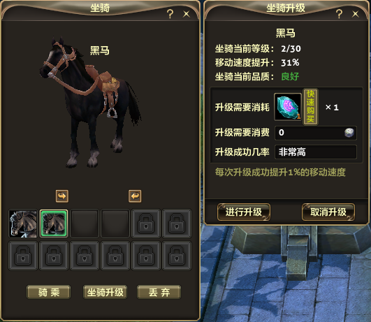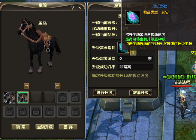 便捷的升级界面:玩家只需点击坐骑面板里的“坐骑升级”按钮,就能打开一目了然的升级界面,轻松打理坐骑的成长。