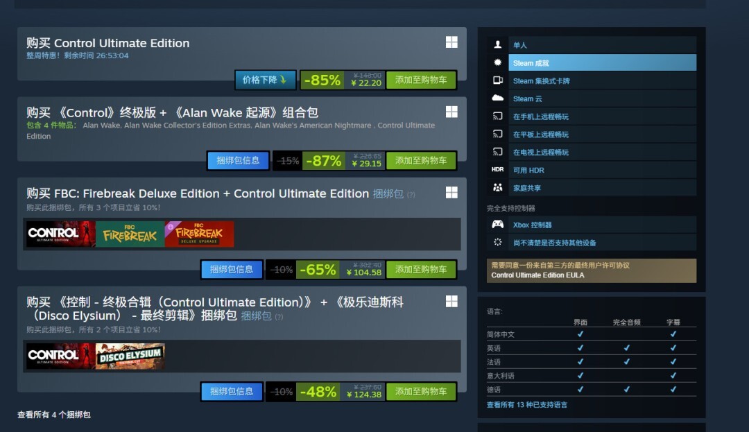 《控制1》Steam版正在促销,-85%,原价148元,现价22.2元,史低价14.8元