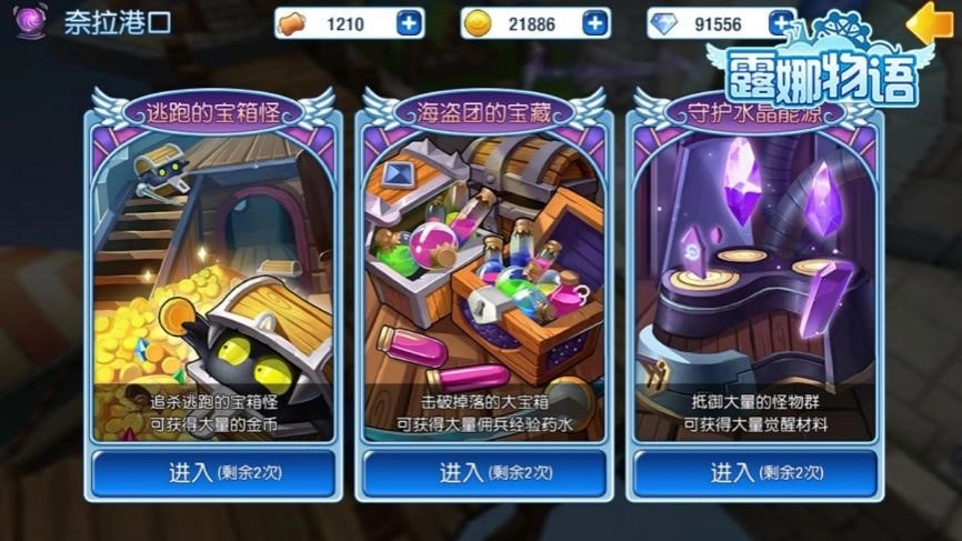 奈拉港口坐落于主城的西门,这里具备3种常规副本玩法,分别为贪婪的宝箱怪、海盗团的宝藏以及守护水晶能源。每次挑战奈拉港口都需耗费5个体力,而且每日针对每种秘境副本的挑战上限设定为2次。成功挑战后,玩家能够获取大量金币、佣兵材料以及觉醒材料等诸多奖励。