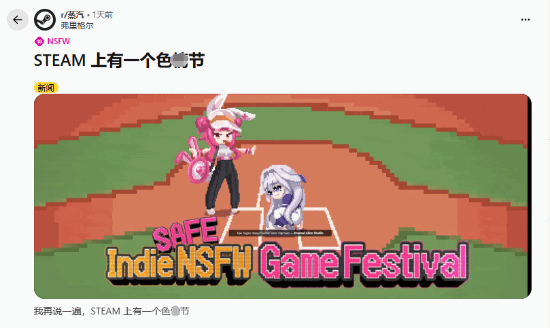 值得一提的是,由于澳大利亚保守组织“Collective Shout”施加压力,Steam曾对平台上众多成人向内容采取删除或屏蔽搜索的措施,所以不少玩家将这一游戏节看作社区的反击。有玩家感慨,主办方为避免受到审查,特意在活动名称里加入了“安全”(Safe)一词,与活动主题“NSFW(Not Safe for Work)”相呼应,形成了一种颇为有趣的反差。