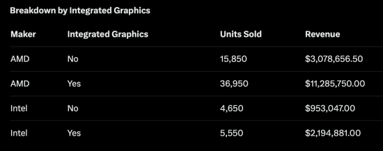 最值得留意的是,AMD旗下的9800X3D与7800X3D两款处理器,凭借出众的游戏性能表现,各自售出了8000颗,稳稳占据销售榜单的靠前位置——单是其中一款产品的销量,就几乎与Intel全系列处理器的总销量不相上下了。