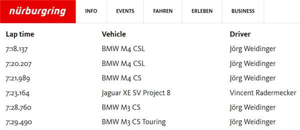 沿着这个思路打开纽北的官网我们更能发现, M3 CS 旅行版的圈速相比轿车也仅仅只慢了 0.73 秒,成绩几乎相同。