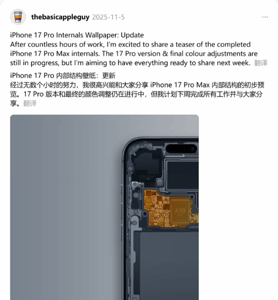 Basic Apple Guy在完成两款Pro机型的壁纸设计后并未止步,他通过社交媒体表示,接下来的创作计划是为苹果新款设备iPhone Air打造对应的内部结构壁纸。