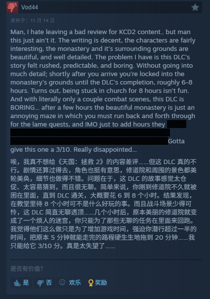 《天国拯救2》规划中的最后一个DLC《修道院瘟疫》已经推出,当前该DLC在Steam平台上的评价呈现褒贬不一的状态。