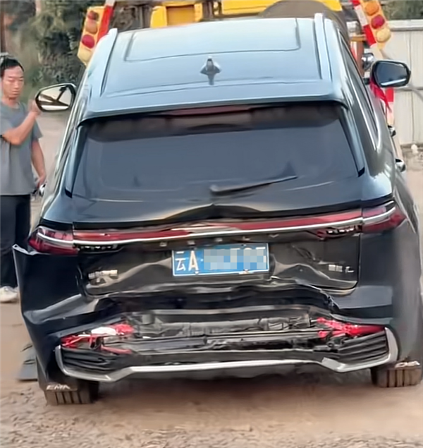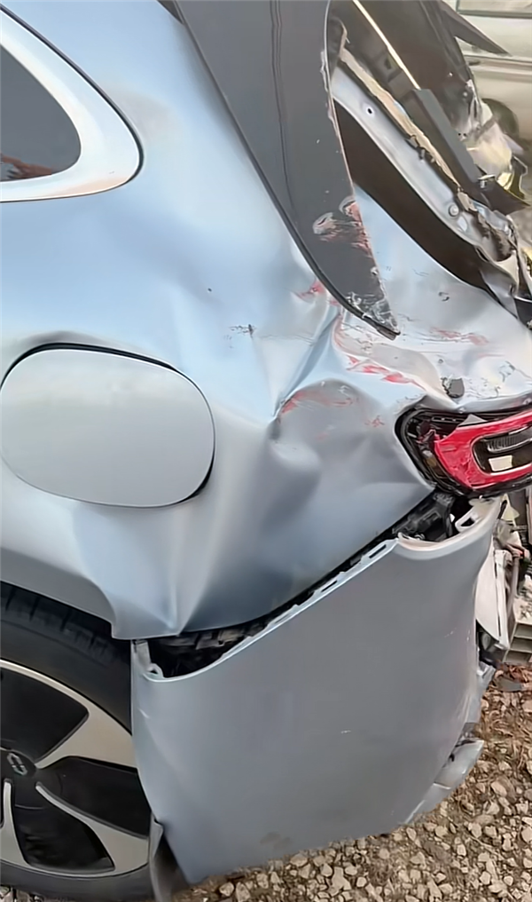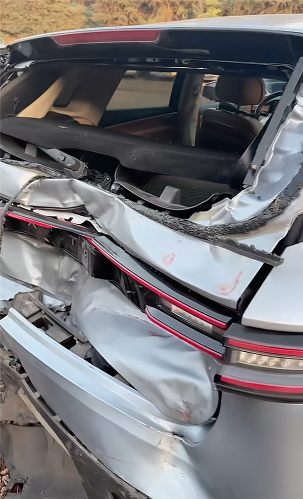 车主本人情绪平复后,自己拿出手机拍摄了事故现场。从画面中能看到,M5被追尾后损伤相当严重,后挡风玻璃已经碎裂,保险杠和尾门塌陷得很厉害,内部厚实的防撞梁都露了出来。