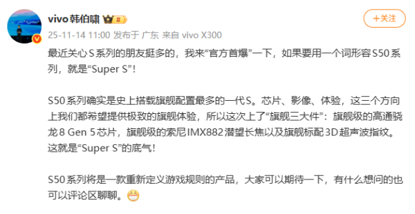 除此之外,vivo产品经理韩伯啸还通过「官方首爆」的形式补充了相关细节,他用「Super S」来概括该系列的核心亮点,同时表示这是S系列有史以来搭载旗舰配置最多的一代机型。据了解,S50系列配备了「三大旗舰件」,具体包括旗舰级的高通骁龙8 Gen 5芯片、旗舰级的索尼IMX882潜望长焦镜头,以及旗舰机型标配的3D超声波指纹技术,力求在芯片性能、影像能力和使用体验这三大方向上,为用户带来极致的旗舰级表现。