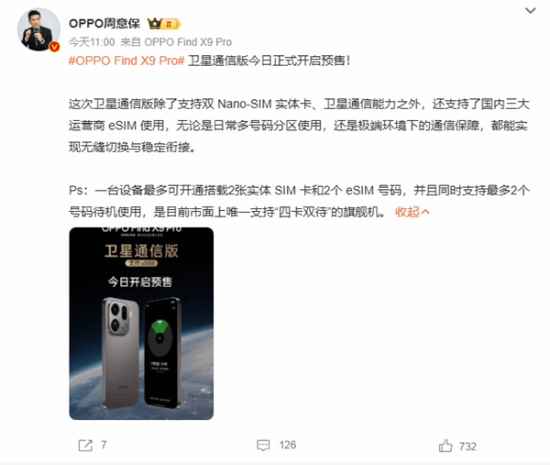 OPPO Find X9 Pro卫星通信版在国内首次达成“四卡双待”功能,该机型配备双实体SIM卡槽,并且支持双eSIM。