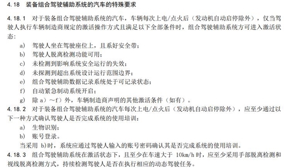 此外,组合驾驶辅助系统在激活状态下,当车速大于10公里/小时,应至少采用手部脱离检测和视线脱离检测方式,持续检测驾驶人是否在执行相应的动态驾驶任务。