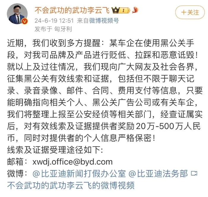 值得一提的是,为了有力打击网络黑公关乱象,比亚迪之前出台过一项长期举措:针对能提供符合要求线索的提供者,将给予5万元到500万元不等的奖励。