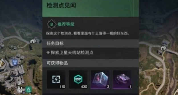 该任务的接取地点位于代盾检测点。玩家落地传送塔后,朝着十点钟方向跑去,就能找到对应的NPC并接到任务。任务描述中,系统会要求你对这个检测点进行一番探索,并拿走此地有用的物品。接下来,首先要探索的地方是卫星天线,这个地方有系统指引,小伙伴们只需按照指引方向前行即可。到达指定位置后,会看到一个楼梯,上去后能瞧见一个带有芯片锁的宝箱,与该宝箱进行互动就行。