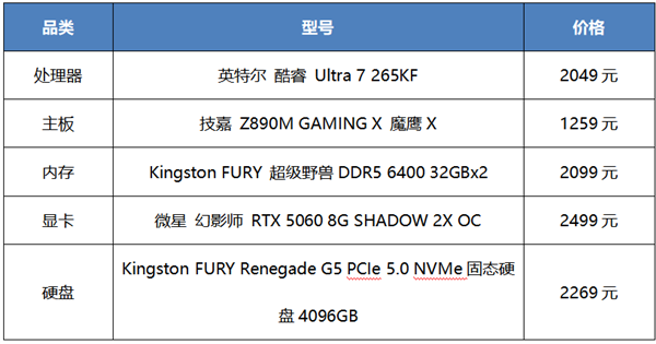英特尔酷睿Ultra 7 265KF处理器配备8个性能核心、12个能效核心,总计20线程;性能核心的基础频率为3.9GHz,最高睿频可达5.5GHz,能效核心的基础频率3.3GHz,最高睿频4.6GHz;二级缓存容量为36MB,三级缓存则有30MB。主板选用了技嘉Z890M GAMING X魔鹰X,该主板搭载8+1+2相供电模组,内存方面支持最大256GB的DDR5规格,甚至能兼容8800+MT/s速率的内存;存储接口配备3组M.2插槽,其中一组还支持PCIe 5.0x4模式,为后续硬件升级提供了充足空间。