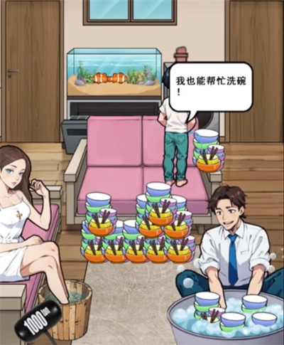 1、随后将碗拖至【鱼缸、洗碗机、洗衣机、财神爷】处。