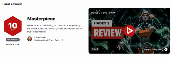 IGN曾为《哈迪斯2》打出10分的满分评价!这款游戏的艺术呈现堪称惊艳,角色塑造极具魅力,战斗系统节奏明快、充满乐趣且变化丰富,同时兼具深度的战术性,配乐也同样亮眼出众!