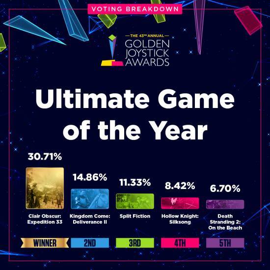 此外,依据官方披露的数据,在“终极年度最佳游戏大奖”评选中,《光与影:33号远征队》的得票率达到了30.71%,这一比例比第二名《天国:拯救2》高出一倍还不止!