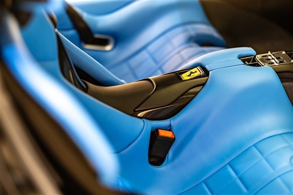 这款车的车身极具雕塑感,全车配备多处空气动力学套件,采用独特的蝶翼门设计,同时搭载可拆卸硬顶,既能带来敞篷驾驶的乐趣,又能保证硬顶状态下的稳定性。内饰以蓝色为主色调,运用碳纤维与Alcantara高级材质打造,并配备固定式赛车座椅。