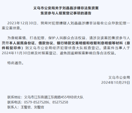 此前义乌公安在通告里公布过嫌疑人全名的情况,像2024年12月30日发布的“关于刘晶晶涉嫌非法集资案集资参与人报案登记事项的通告”,这也是一起非法集资案,同样公开了嫌疑人的全名。