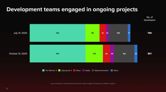 据Insider Gaming消息,CD Projekt Red在2025年第三季度财报电话会议上披露了工作室目前的部分情况,并且能看到他们比之前为各个正在开发的项目都新增了开发者。