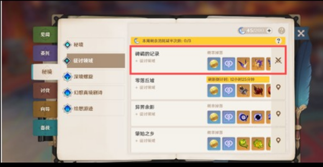 背水的逆转诗成就对应的战斗,在碑碣的记录副本里,位置就在奶奶突破材料区域的右下角。要是还没推进主线剧情,能通过界面右上角的小书图标进入秘境界面,然后选择征讨领域中的碑碣的记录,直接开启挑战。虽说可以跳过主线提前参与,但建议优先完成相关主线任务,这样能避免剧情剧透影响体验。这个副本支持选择不同等级难度,推荐等级60级的玩家,可以试试通过低等级副本减轻战斗压力,用逃课打法通关。