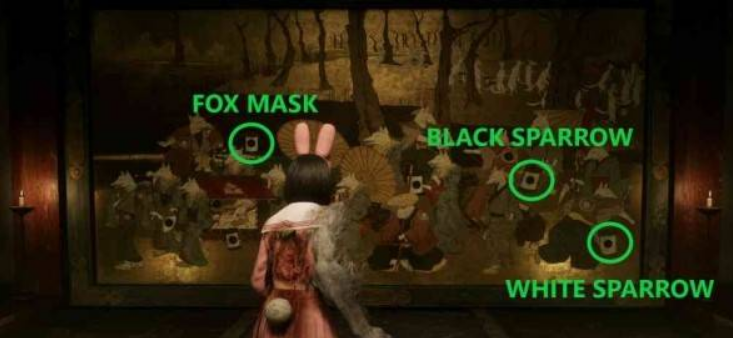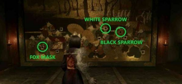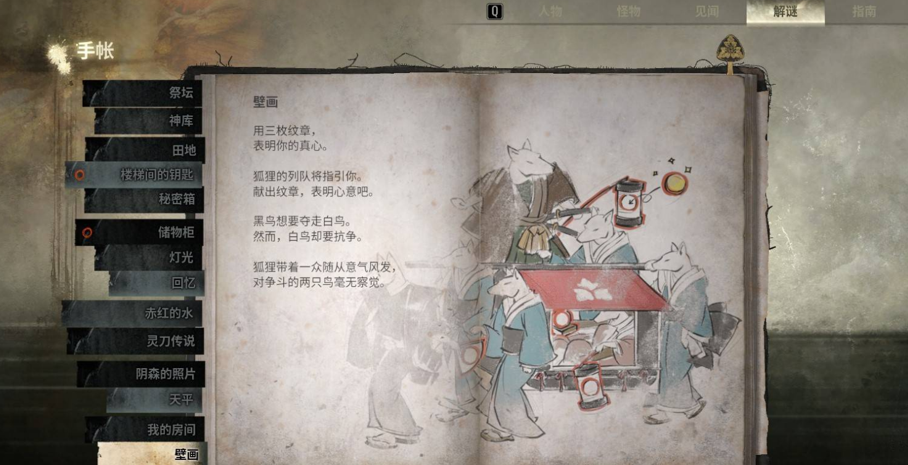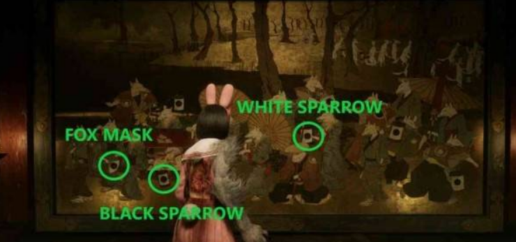 将黑雀纹章放置在狐面纹章右侧的空位上,对应的图案是红箱子下方的灯笼。