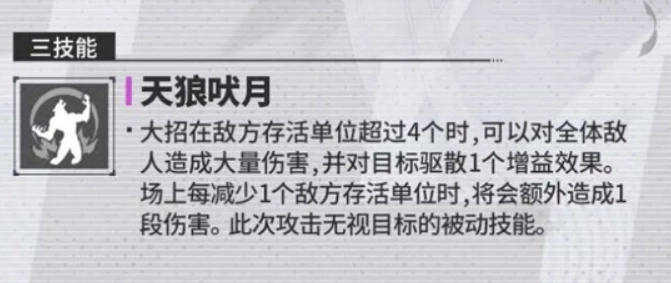 无狼吠月是博尔涅的终极技能,具备强劲的群体攻击能力。当敌方单位存活时长达到4秒以上时,该技能可对所有敌人造成大范围伤害,同时驱散目标身上的增益效果。每有一名敌方单位被消灭,技能就会额外增加一段等同于普攻伤害的附加打击。该技能拥有无视目标被动技能与反击机制的特点,在应对带有反伤或反击类技能的敌人时效果显著,能够在不受干扰的情况下顺利完成输出过程。