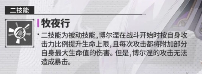 牧夜行是博尔涅的核心被动技能。战斗开始时,他会按照自身攻击力的一定比例增加最大生命值,这种设定让攻击力与血量产生了联动效果。在此基础上,他的每一次普通攻击都会附带基于最大生命值百分比的真实伤害。需要注意的是,这类附加伤害不能触发暴击,所以后期的成长主要依靠堆叠生命上限。若想让该技能的收益达到最大化,前期就需要着重提升博尔涅的生命值属性。