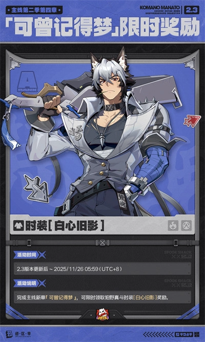 1、完成主线新章「可曾记得梦」:需完成2.3版本主线新章「可曾记得梦」,就能限时获取狛野真斗的时装「白心旧影」。