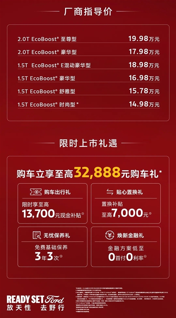 前脸延续福特经典设计语言,配备全新大气风格的进气格栅,同时取消了老款车型的分体式大灯组,升级为一体式设计,还新增了“赤霞红”与“沧海蓝”两种车身颜色。