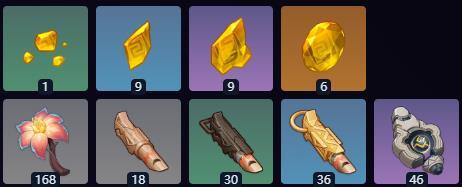 坚牢黄玉碎屑1份、坚牢黄玉断片9份、坚牢黄玉块9份、坚牢黄玉6个,这些材料均由岩系敌人掉落。