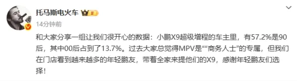 12月10日,小鹏汽车副总裁“托马斯电火车”发布内容称,在选择小鹏X9超级增程车型的车主里,90后车主占比达到57.2%,00后车主占比也有13.7%。他还提到,过去常被认为是“商务人士”专属座驾的MPV车型,现在正受到越来越多年轻消费者的青睐。