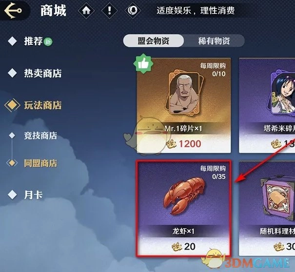 2、随后在同盟商店里,点击左侧的玩法商店,寻找到龙虾并购买。