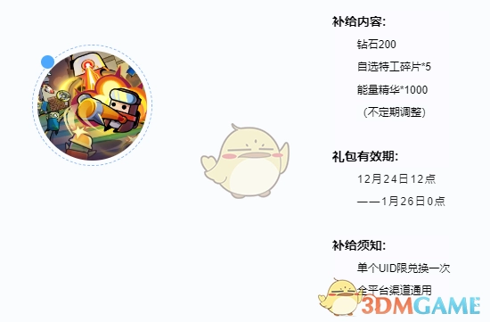 礼包码20:冬日惊喜(内含富甲一方头像框一个、300钻石、2个复活币以及1个精良配件箱)