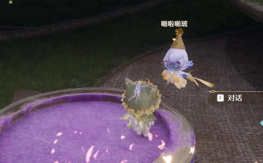 2、身形变小后,与小精灵啪啦啪玻交谈,它会让我们踩一个爱心。