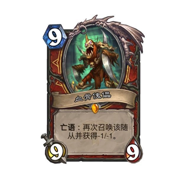 目前已公布的新橙卡共有两张,其中一张是战士的职业橙“血骨傀儡”,它的属性为9费9攻9血,亡语效果是再次召唤该随从并使其获得-1/-1。这个特殊效果看似有持续作战能力,实则缺乏稳定性,且未被沉默时会不断以9-9、8-8、7-7的形态循环召唤,属于暴雪一贯喜欢设计的套娃式机制。