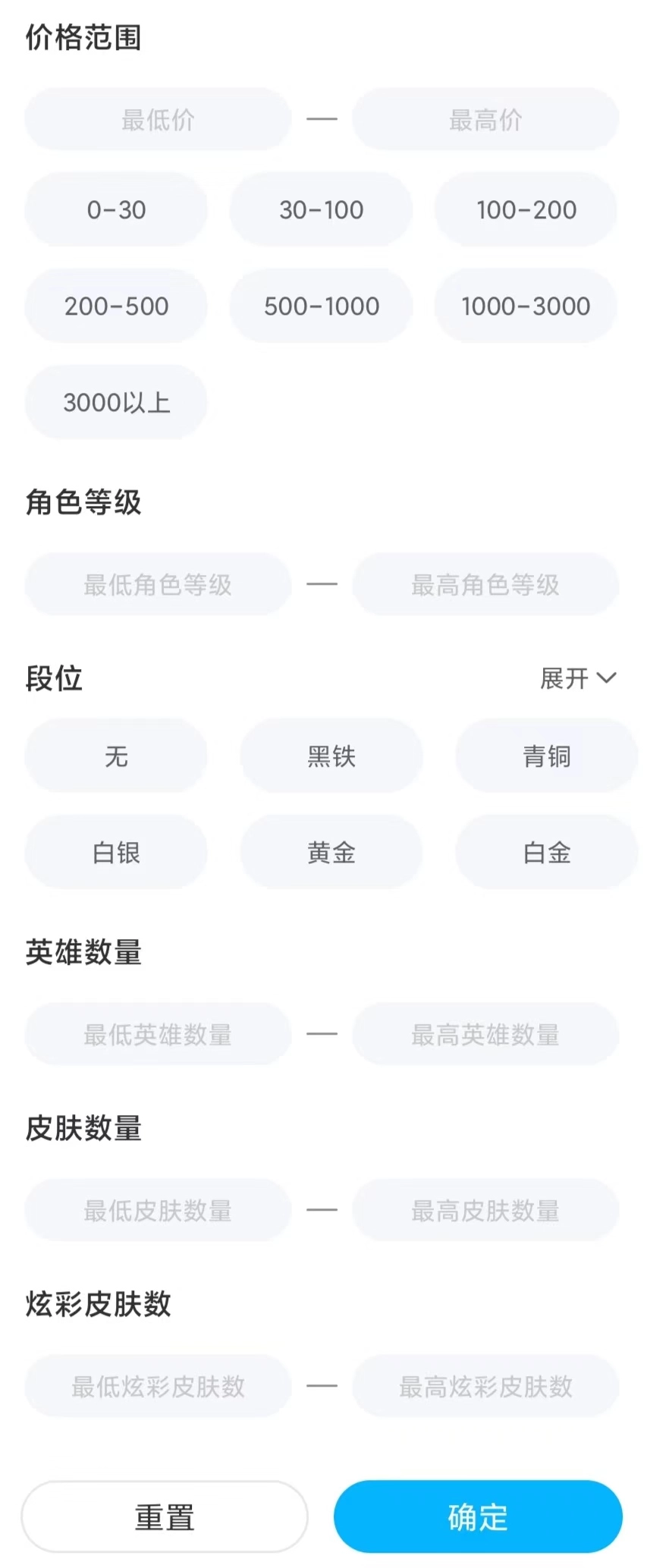 玩家给LOL账号估值,首先得明确自己账号的段位、英雄数量、皮肤数量以及幻彩皮肤数量。接着,根据这些信息在交易猫的筛选栏中填入或选择对应内容,系统就会筛选出相似账号。之后,玩家从中挑选匹配度最高的账号,参考其价格来给自己的账号定价。交易猫的筛选功能能让账号估值这件事简单不少。
