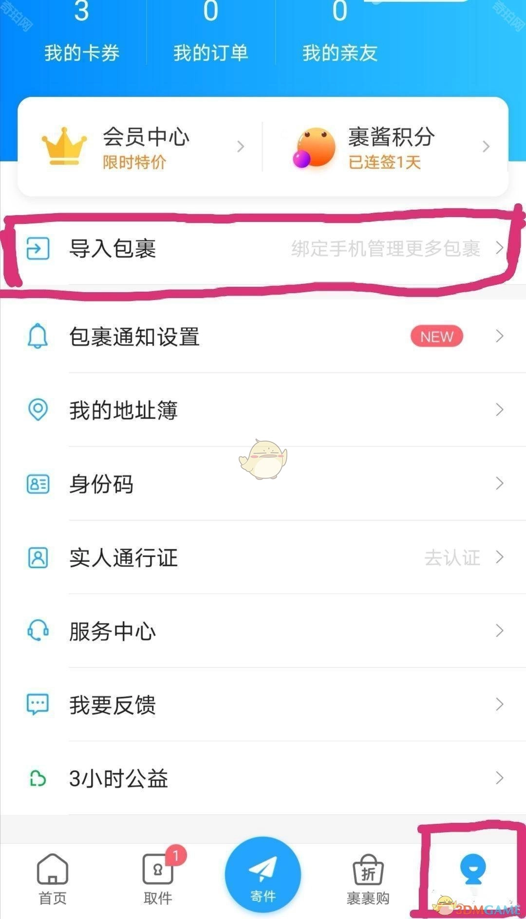 1. 开启菜鸟裹裹app,于“我的”页面寻觅导入包裹选项。
