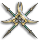 这是一种奇门兵器,拥有双柄且柄身带有尖刺,武器中部的刃锋形状宛如一弯新月。