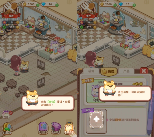 于是我们跟着新手剧情一直走,进入店铺点击右下方“岗位“按钮开始给店铺安排收银员以及研究员(厨师)