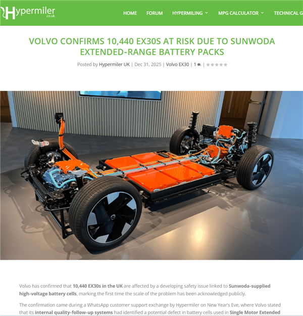 其中,沃尔沃方面已确认,英国地区有10,440辆EX30车型受到欣旺达(Sunwoda)动力电池包相关问题的影响。
