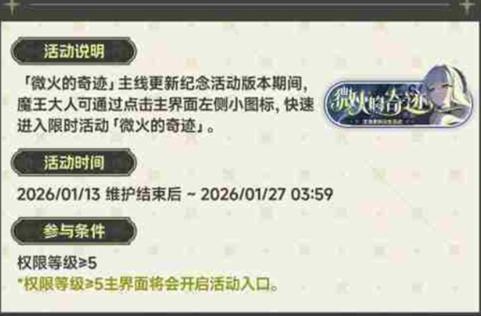 《星塔旅人》官方正式宣布,「微火奇迹」主线更新纪念活动将于明日1月13日维护后正式开启。魔王大人只需权限等级达到5级及以上,就能通过左侧入口直接进入活动页面,抵御智慧植物,获取报销凭证,并兑换相应奖励!