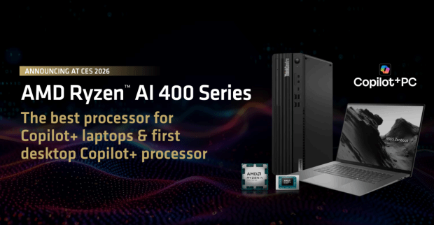 AMD在CES 2026展会上推出了全新的锐龙AI 400系列处理器。这一系列处理器不仅为移动端打造出了表现最佳的Copilot+ PC(即Windows 11 AI+ PC)笔记本产品,还通过插槽式处理器方案带来了首款Copilot+台式机。高性能、长续航与AI能力是全新锐龙AI 400系列处理器的核心优势所在。