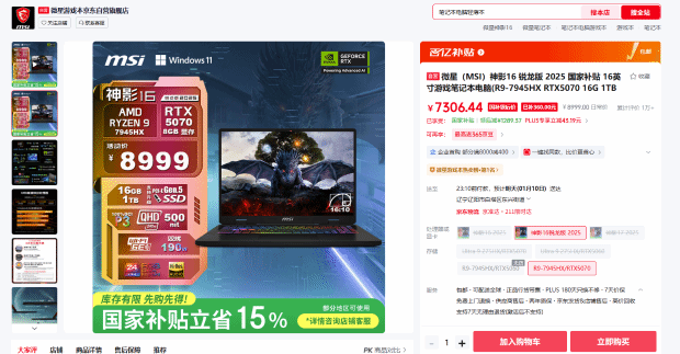 该笔记本AMD锐龙9 7945HX处理器 + 115W满功耗RTX 5070笔记本GPU配置组合的当前售价为7306元。