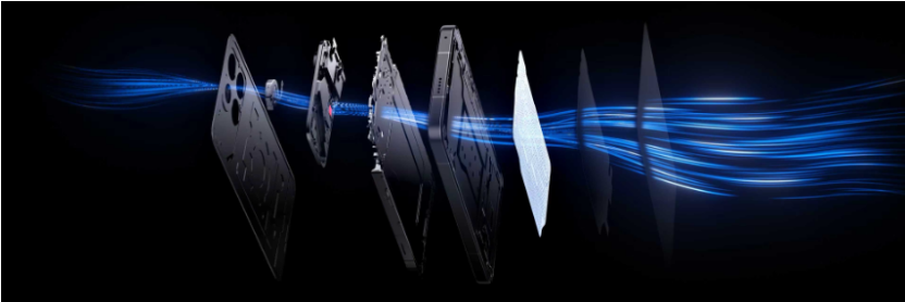 行业内此前的手机风扇方案,大多沿用了笔记本电脑的传统思路:吸风 > 吹向VC均热板/散热鳍片 > 热量交换 > 排出热风。