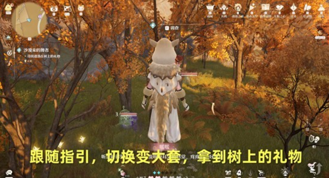 按照指引找到树上遗落的礼物,我们直接换上变大套装,把树上的礼物取下来。